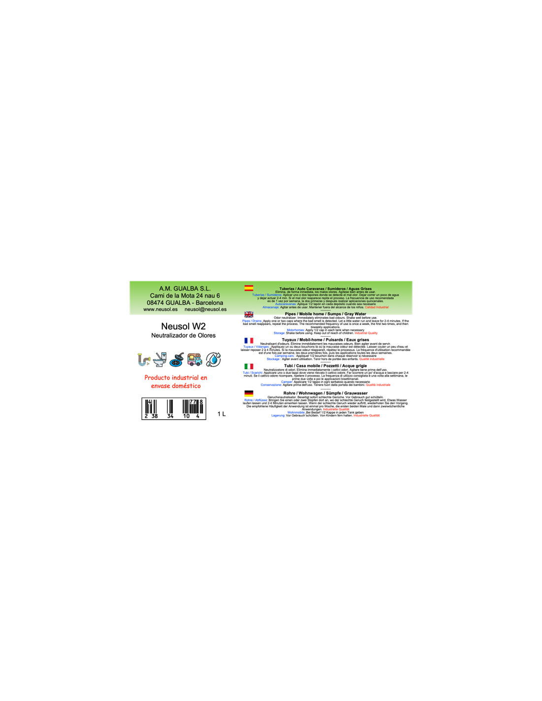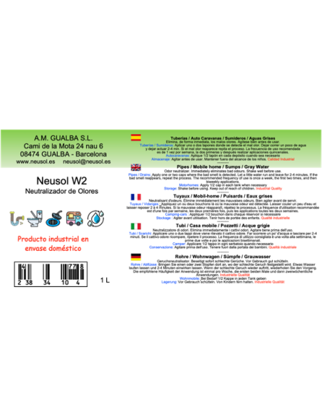 NEUSOL W2 Elimina, de forma inmediata, olores procedentes de residuos y aguas grises. Ideal, también, para aplicar en depósitos de autocaravanas o en aguas grises de hoteles, residencias, hospitales, residencias de mayores, colegios, campings... Las aguas grises tratadas con Neusol W2 se pueden reutilizar para cisternas, riego o limpieza exterior